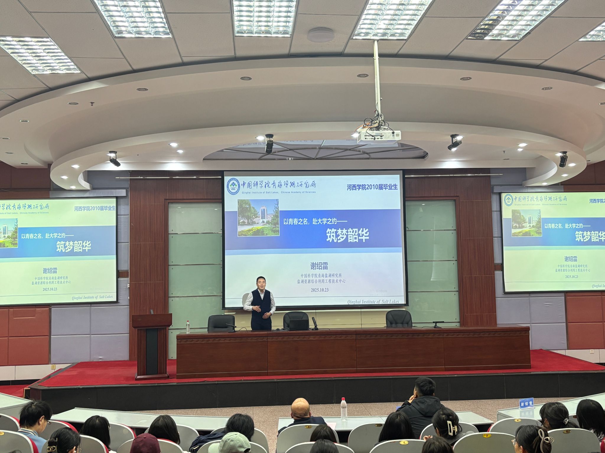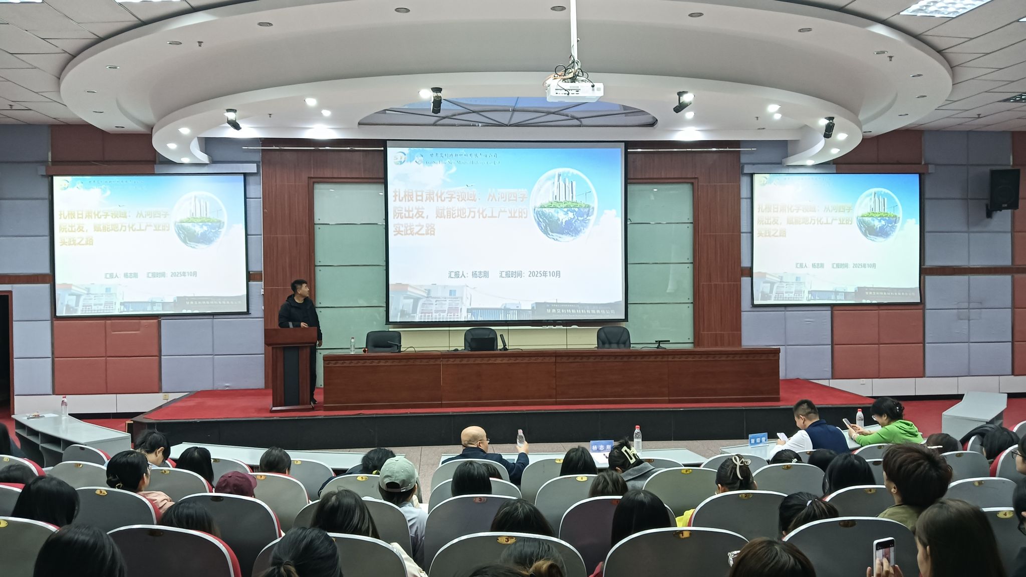 会上,2010届化学系校友、中国科学院青海盐湖研究所副研究员谢绍雷,以“科研逐梦”为主题,回顾了从河西学院本科到兰州大学博士的求学历程。他从自身的科研成果,生动诠释了“坐得住冷板凳、啃得下硬骨头”的科研精神,鼓励学弟学妹夯实专业基础,锚定方向深耕。 2018届应用化学专业校友、甘肃省化工研究院艾利特新材料有限责任公司副总经理杨志刚,则围绕“产业一线的成长之路”展开分享,他结合自身从校园到企业、从技术研发到管理岗位的奋斗故事,展现了“学以致用、知行合一”的实干风采。两位校友针对同学们提出的学业规划、科研入门、职业选择等问题耐心解答。